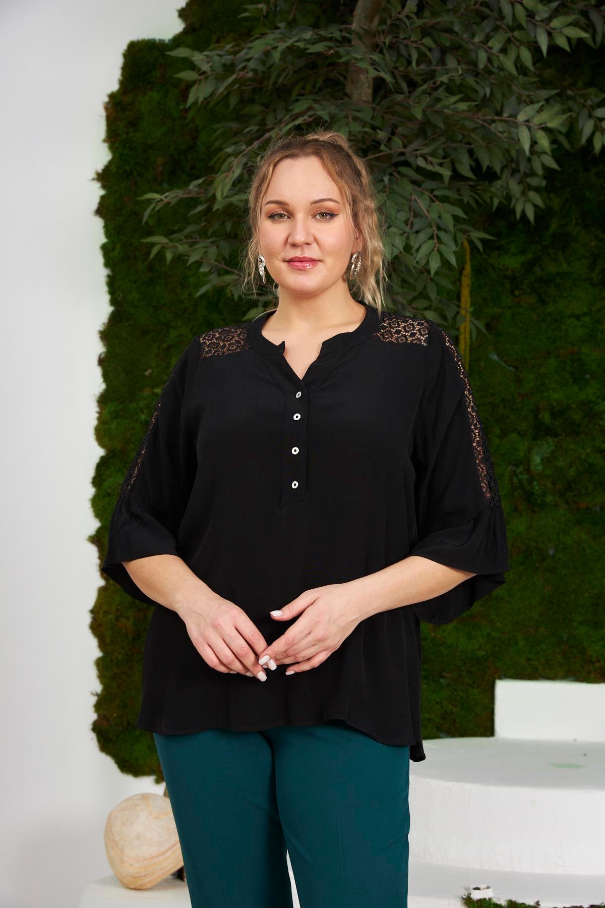Omuzları Ve Kolları Dantel Detaylı Büyük Beden Siyah Bluz (O4558-SİYAH)