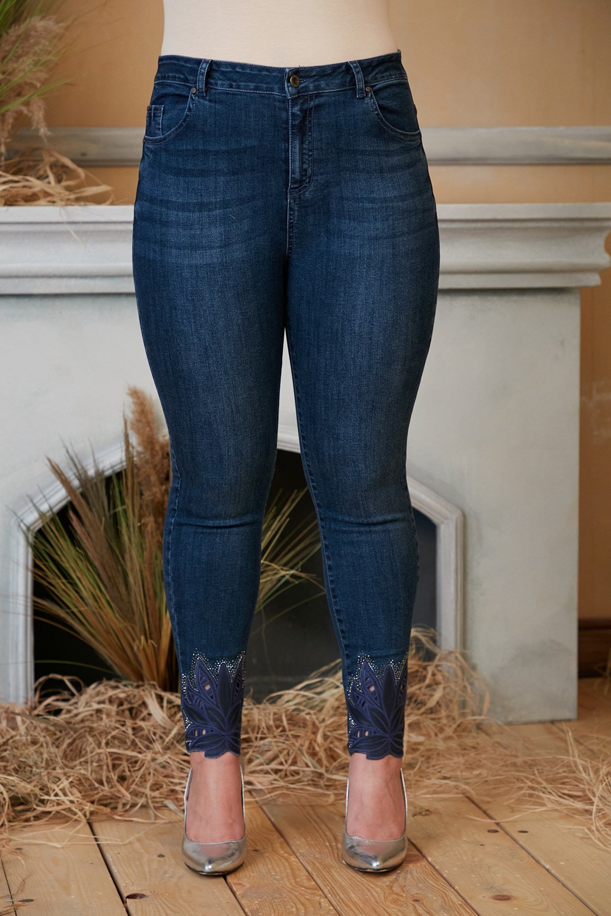 Rmg Paça Lazer Kesim Ve Taş İşlemeli Büyük Beden Lacivert Kot Pantolon