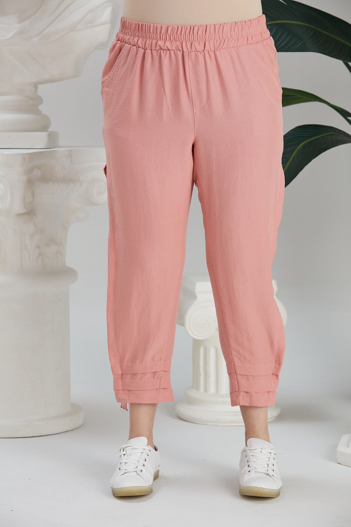 Rmg Paça Yırtmaç Detaylı Beli Lastikli Büyük Beden Pudra Pantolon (1627-PUDRA)