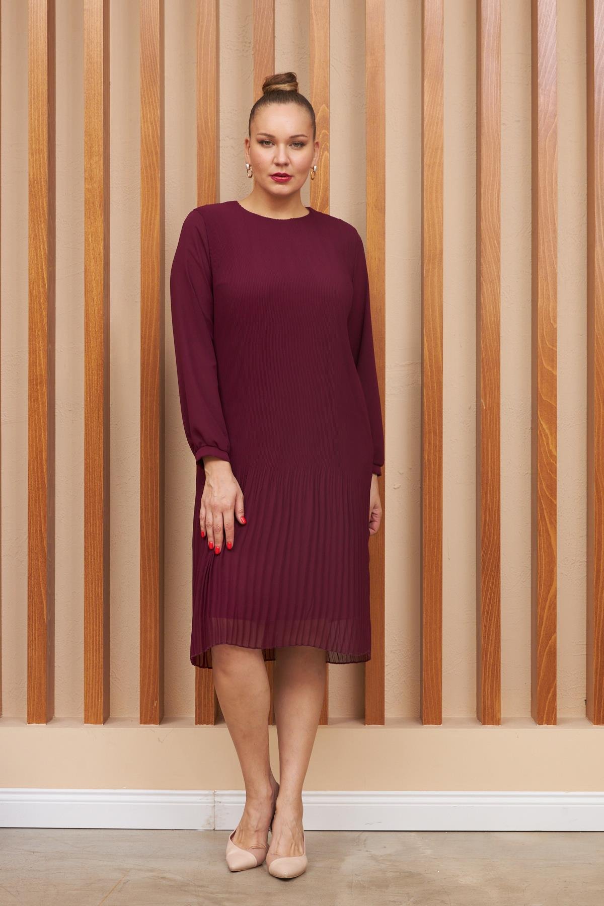 Piliseli Uzun Kol Büyük Beden Mürdüm Abiye Elbise