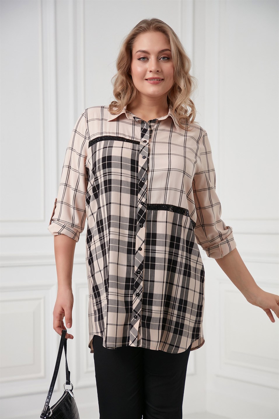 RMG Pul Payet Detaylı Büyük Beden Kareli Krem Gömlek (O4132-KREM)