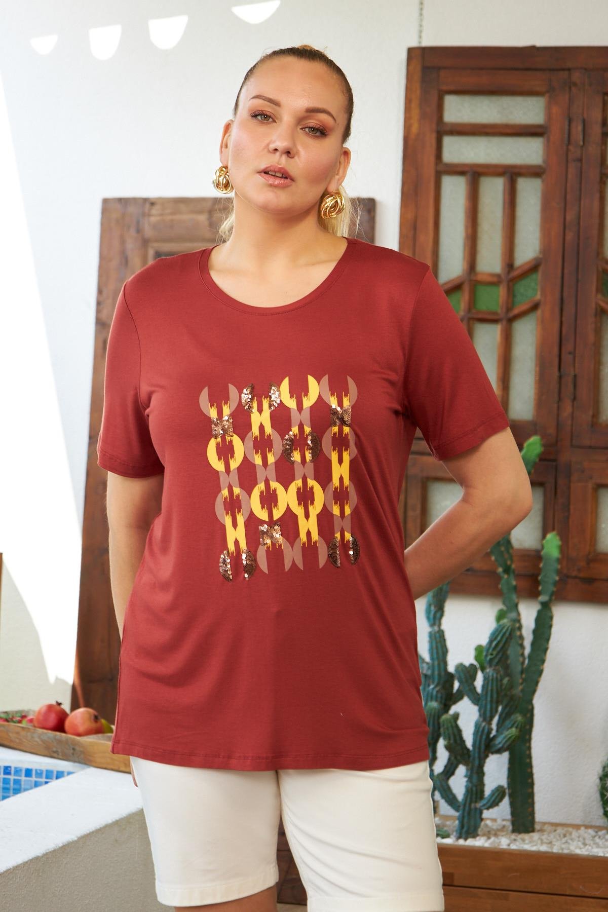 Pul Payet Detaylı Büyük Beden Kiremit Tişört
