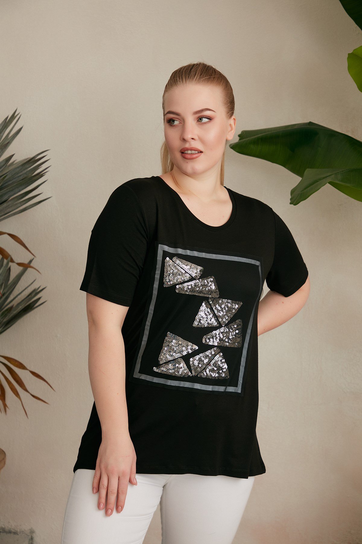 Rmg Pul Payet İşlemeli Siyah Büyük Beden Tişört (O4567-SİYAH)