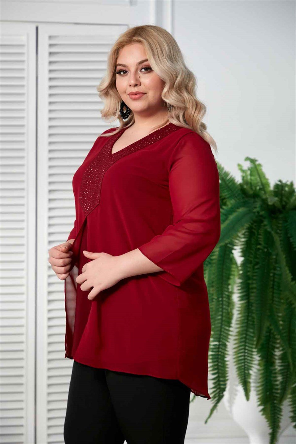 RMG Şifon Kol Taş Detay Bordo Büyük Beden Bluz (O4007-BORDO)