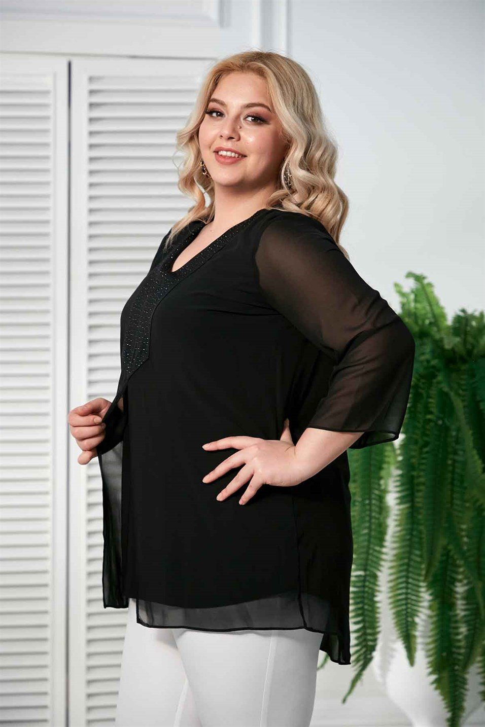Büyük bedenli kadınların her dönemde bluz tercihi yaptığı bilinmektedir. Bu noktada, V yakalı bluzların şıklık ve rahatlık vaat ettiğini söylemek gerekir. Şifon kol detayına sahip olan bu bluz modelinin siyah renkli olması sayesinde fazla kilolarınızı gizleme şansına sahip olabilirsiniz. Bunun yanı sıra, neredeyse her türlü giyim parçasıyla güzel kombinler haline gelmesi mümkündür.