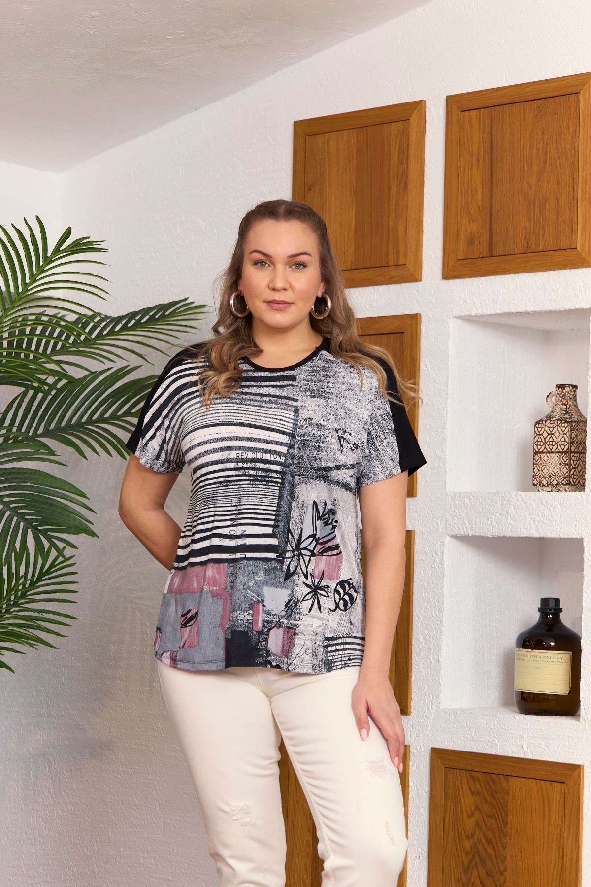 Soyut Desenli Büyük Beden Gri Tişört (O6439-GRİ)