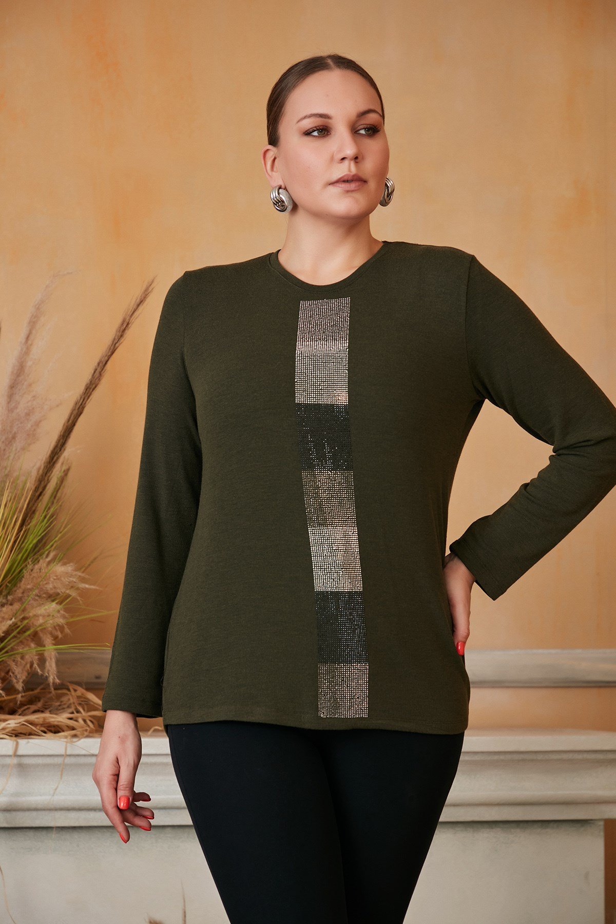 Rmg Taş Baskılı Büyük Beden Haki Bluz (O4341-HAKİ)