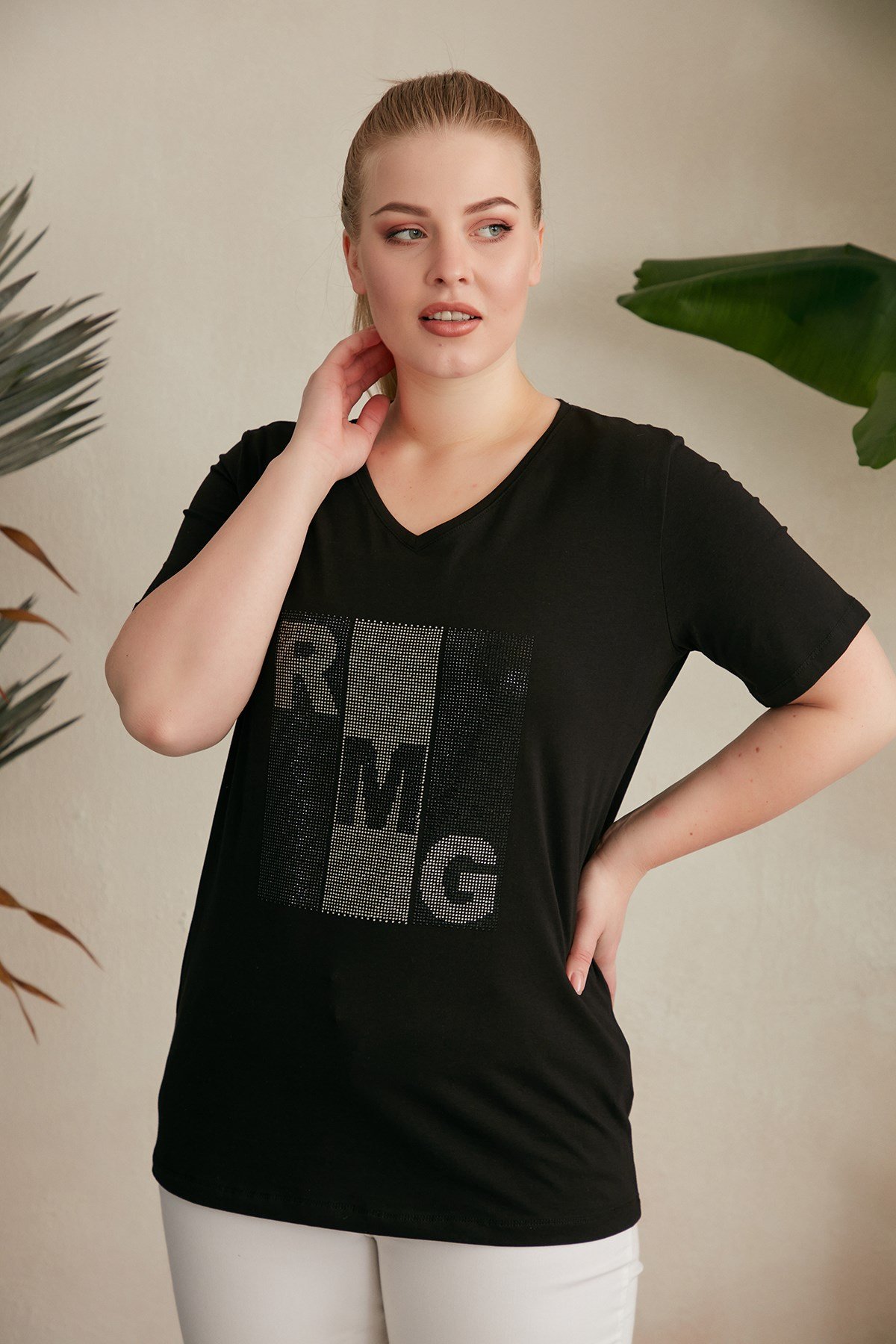 Rmg Taş Baskılı Büyük Beden Siyah Tişört (O4463-SİYAH)
