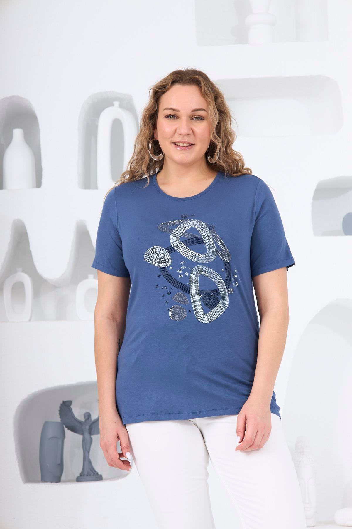 Taş Detaylı Büyük Beden İndigo Tişört (O6401-İNDİGO)