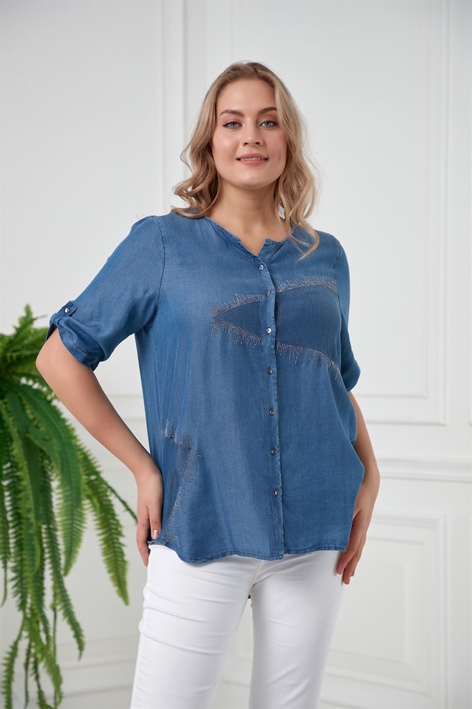 RMG Taş İşlemeli Orta Mavi Büyük Beden Gömlek (O4010-ORTA MAVİ)