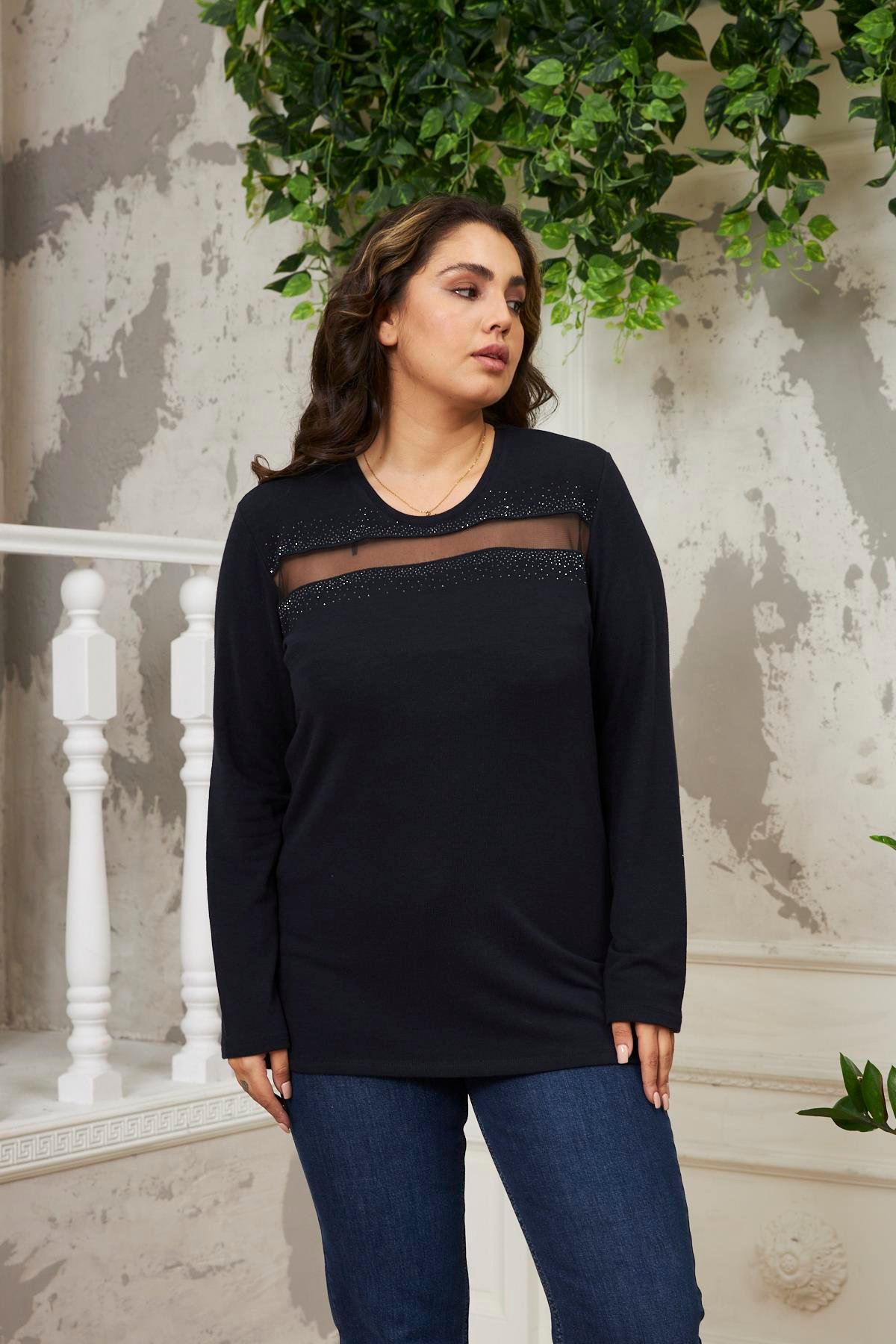 Rmg Taş ve Tül Detaylı Büyük Beden Lacivert Bluz (O6218-LACİVERT)