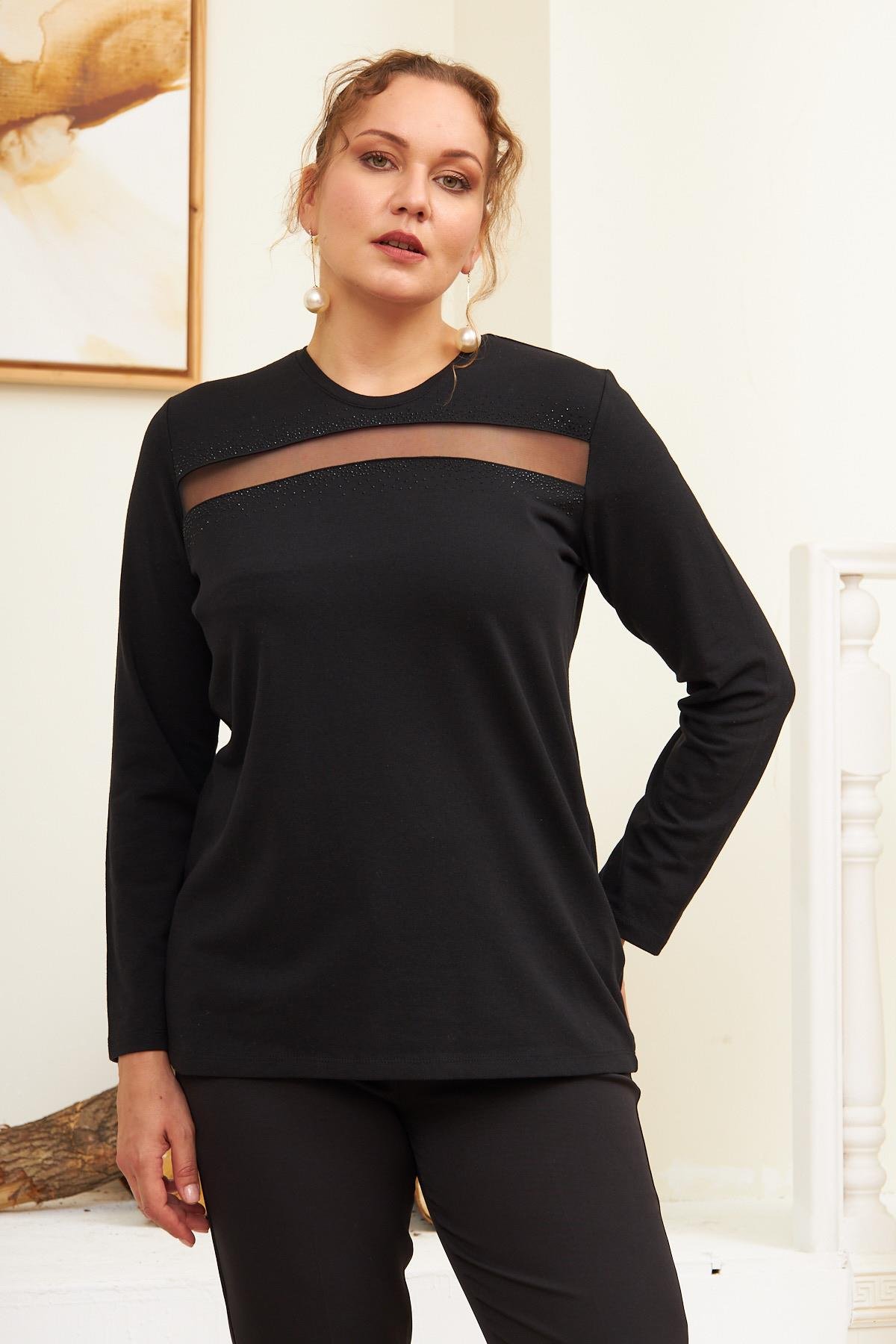 Taş ve Tül Detaylı Büyük Beden Siyah Bluz (O6218-SİYAH)