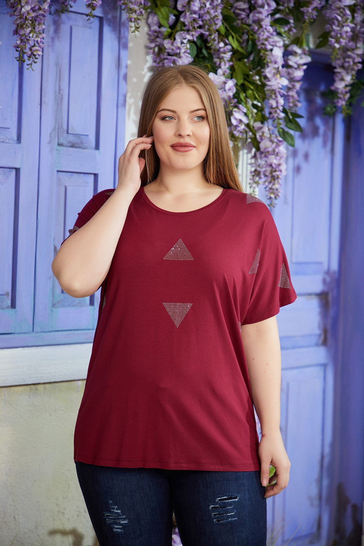 Rmg Üçgen Taş Baskılı Büyük Beden Bordo Tişört (O4869-BORDO)