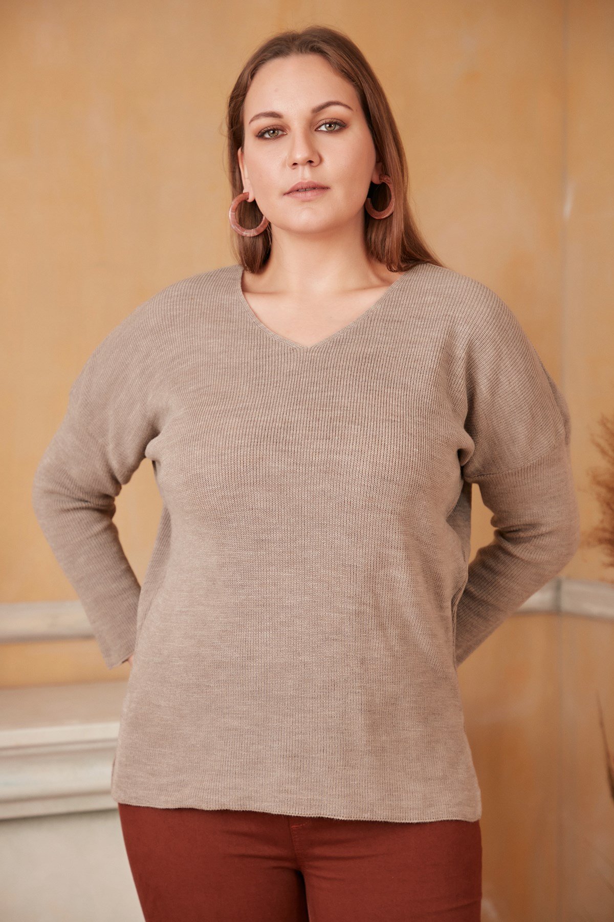 RMG V Yaka Büyük Beden Vizon Triko Kazak
