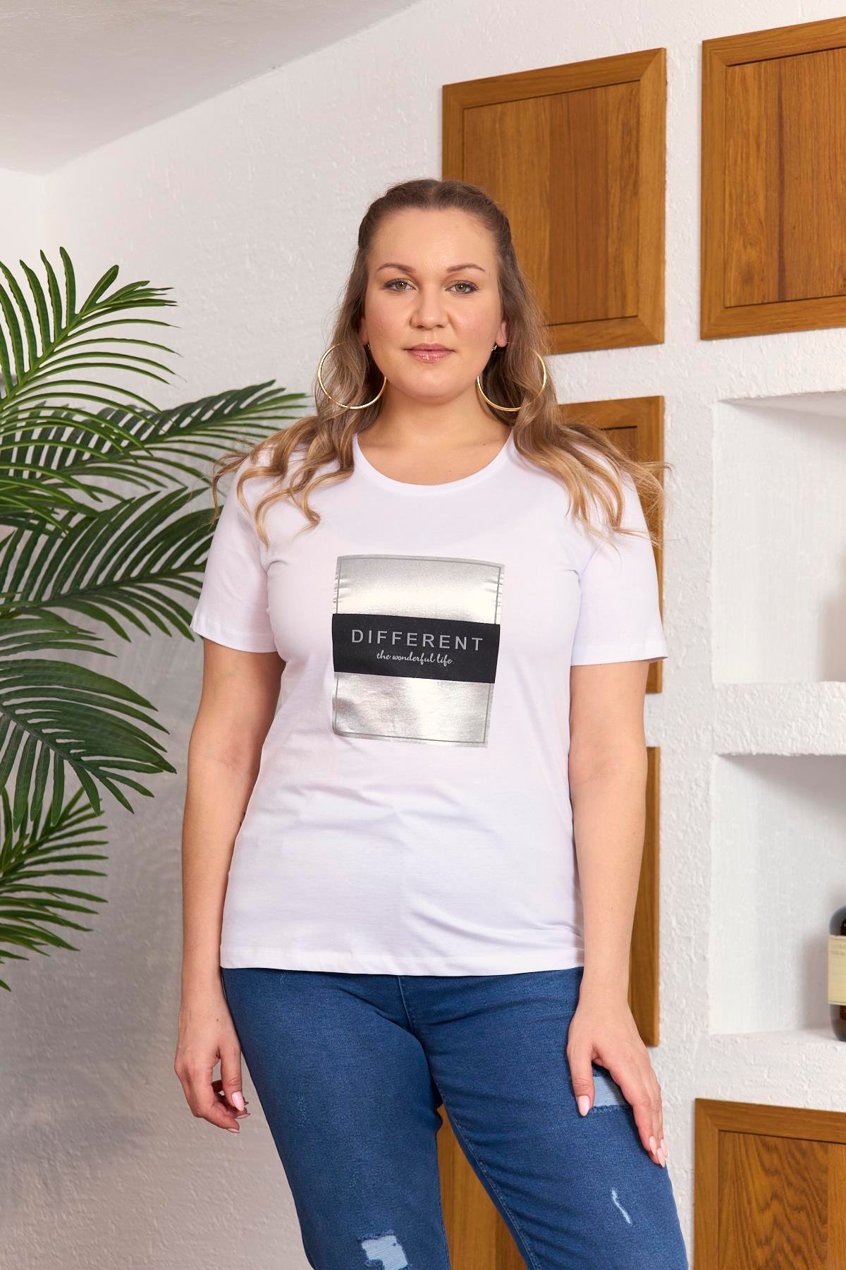 Varak Baskılı Büyük Beden Beyaz Tişört (O6451-BEYAZ)