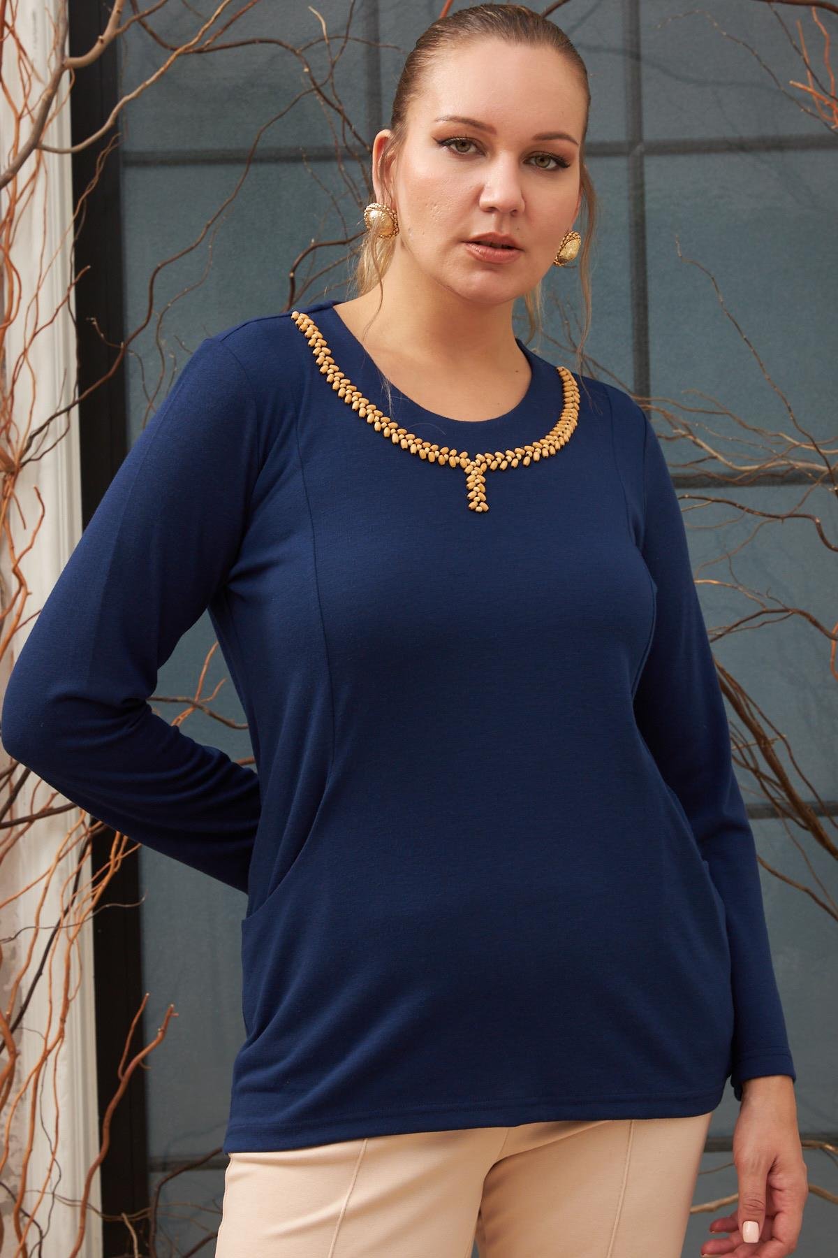 Yaka Aksesuarlı Cepli Büyük Beden Lacivert Bluz (O6186-LACİVERT)