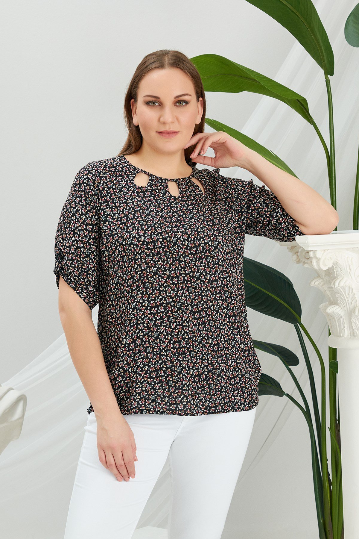 Rmg Yaka Detaylı Çiçek Desenli Büyük Beden Siyah Bluz