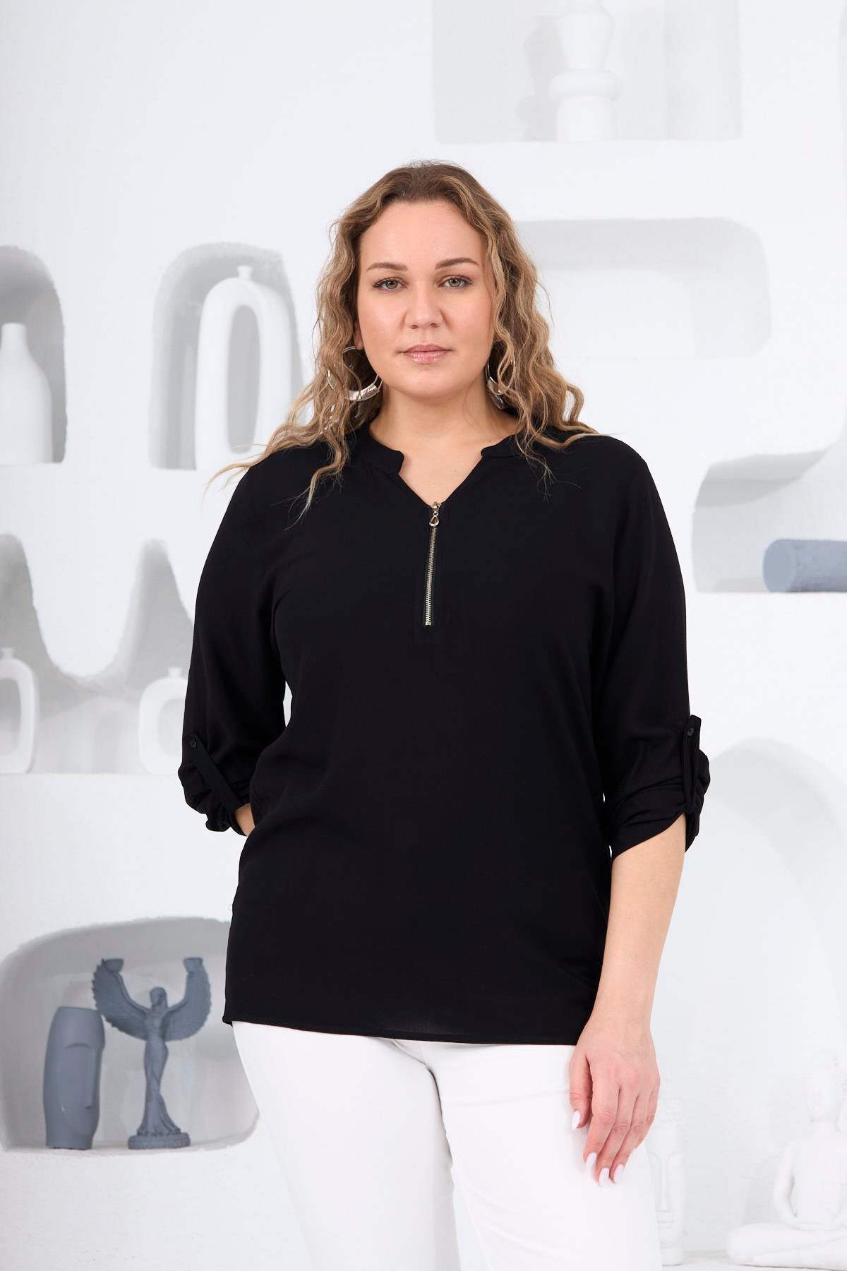 Yaka Fermuar Detaylı Büyük Beden Siyah Bluz (O6326-SİYAH)