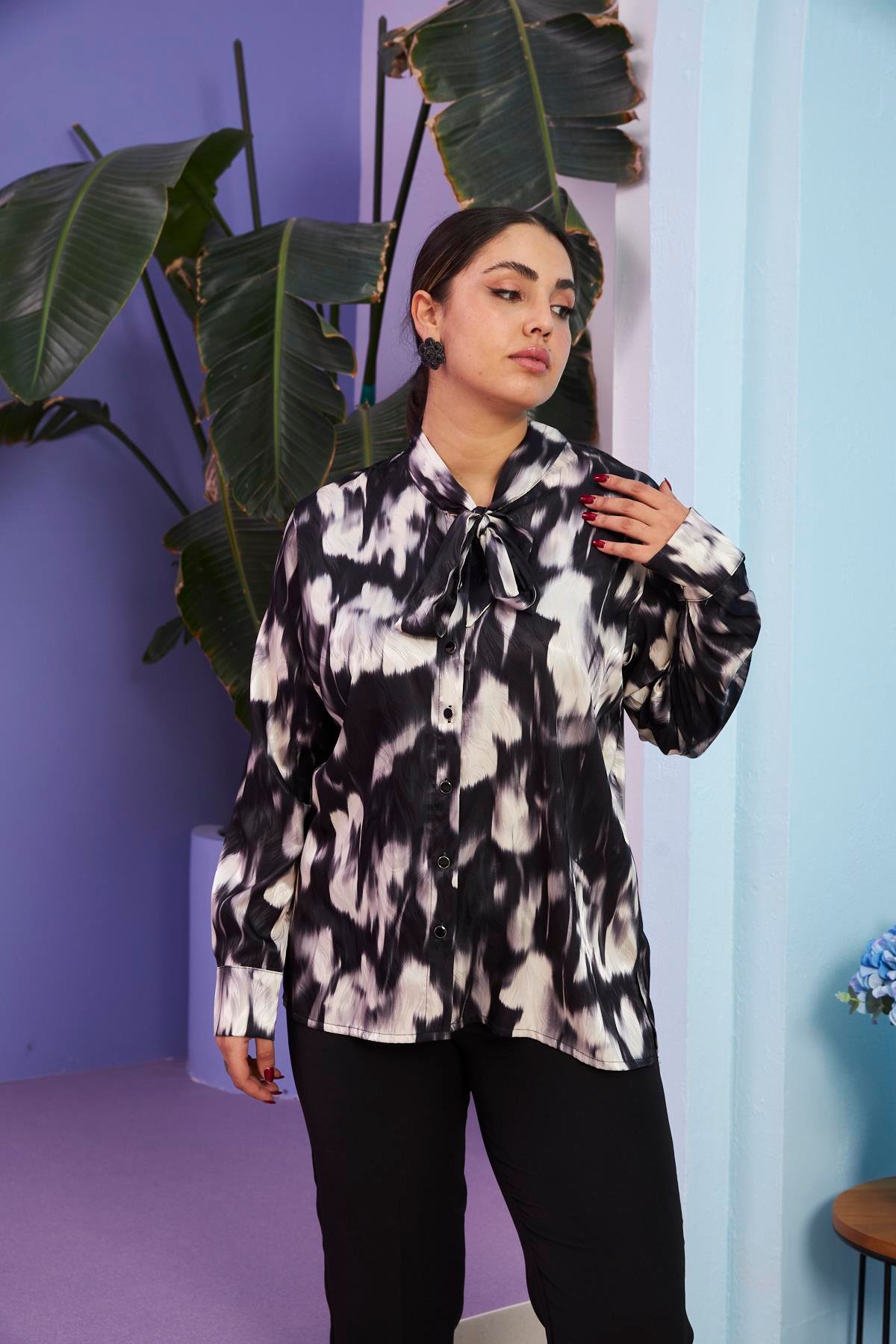 Yaka Fularlı Büyük Beden Desenli Siyah Gömlek