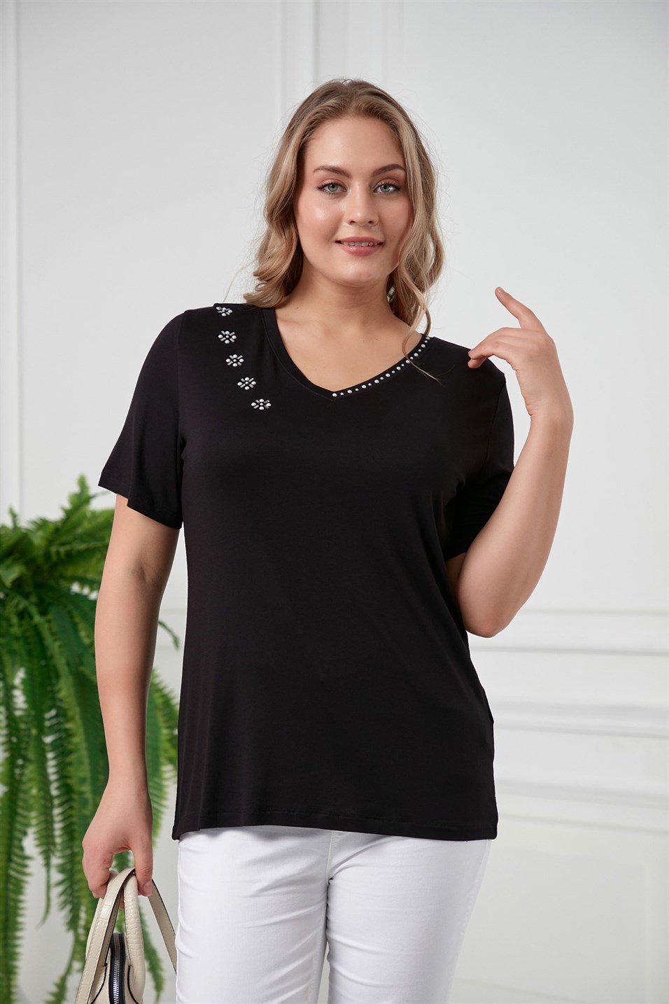 RMG Yaka İnci Taş Detaylı Büyük Beden Siyah Tişört (O4109-SİYAH)