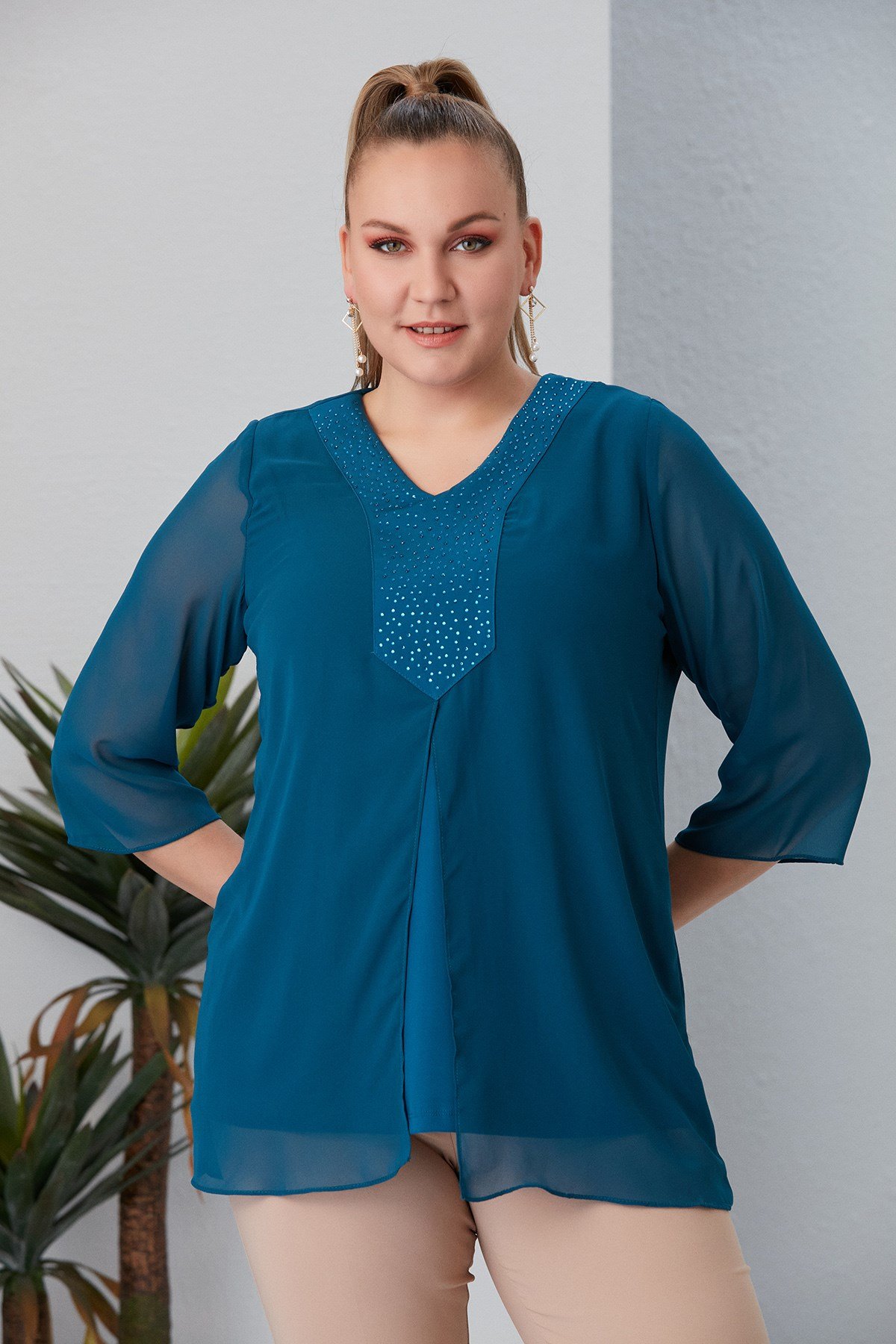 Rmg Yaka Taş Detaylı Kolları Tül Büyük Beden Petrol Bluz (O4823-PETROL)