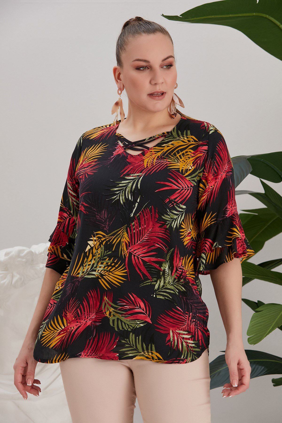 Rmg Yaka Ve Kol Detaylı Çiçek Desenli Büyük Beden Siyah Bluz