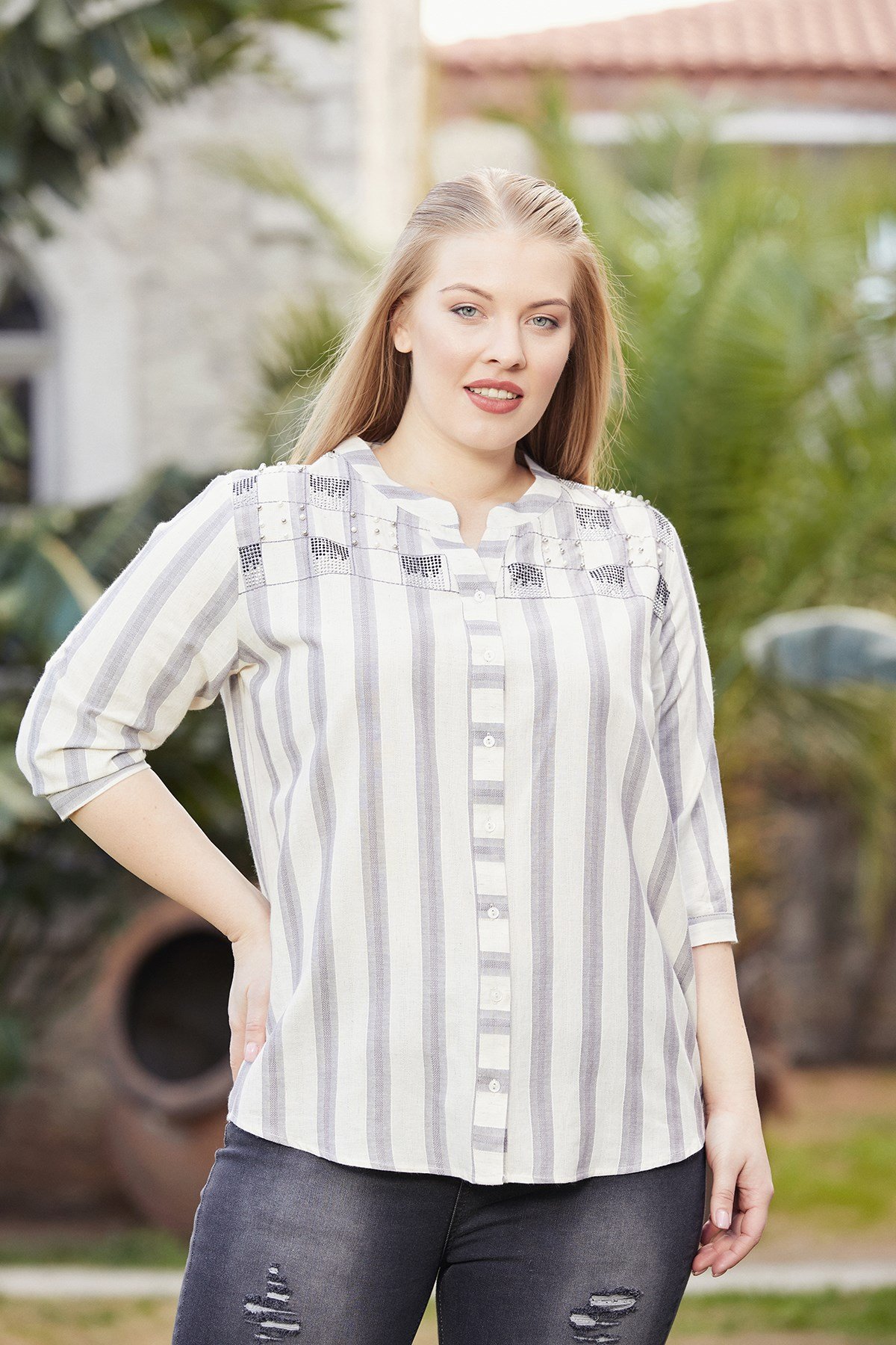 Rmg Yakası Taş Detaylı Büyük Beden Füme Bluz (O4839-FÜME)