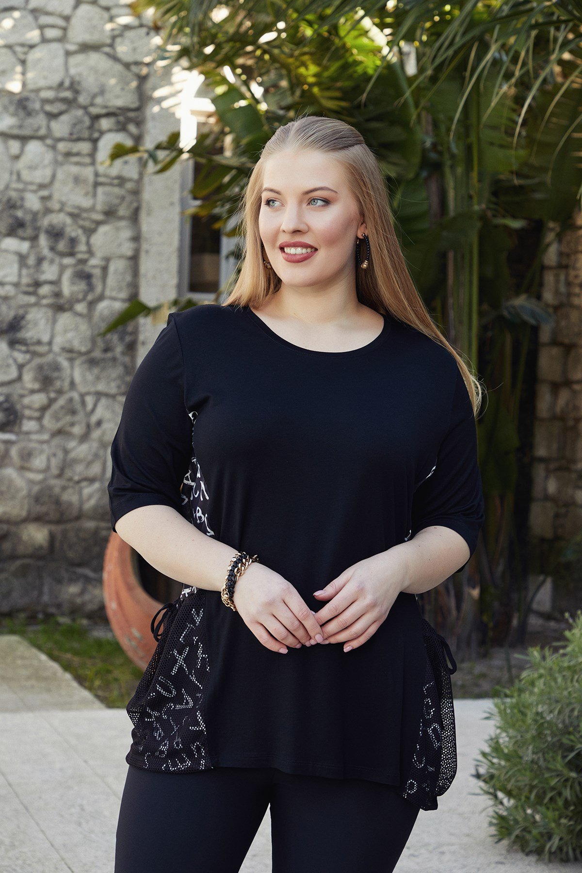 Rmg Yan Cepleri File Detaylı Büyük Beden Siyah Tişört (O4866-SİYAH)