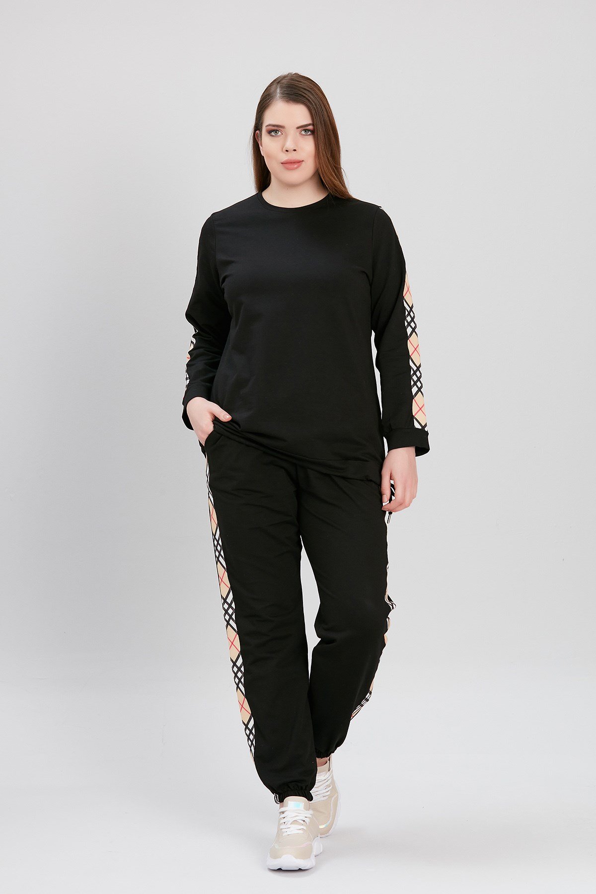 Rmg Yanları Ekose Şerit Detaylı Büyük Beden Siyah Eşofman Takımı