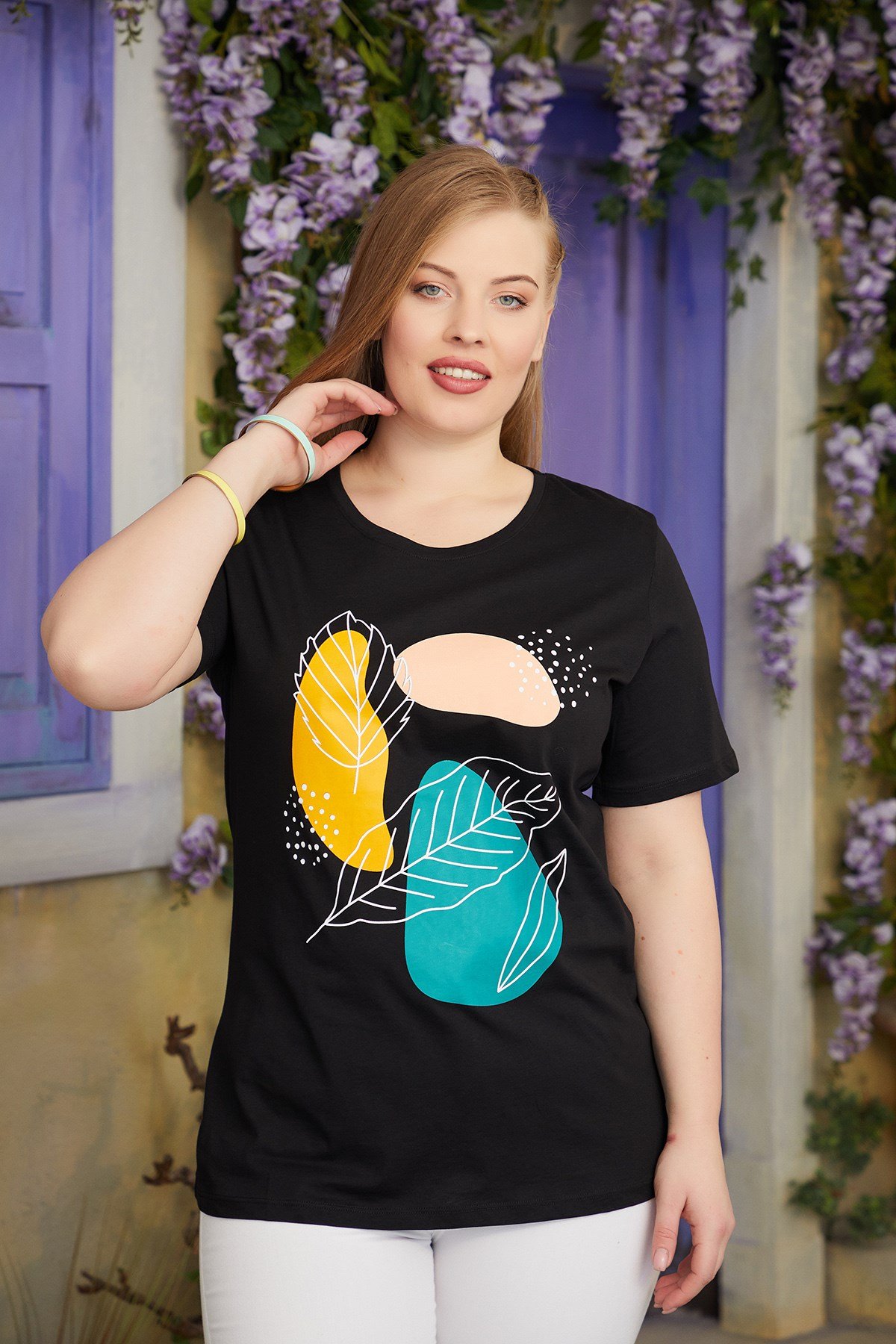 Rmg Yaprak Baskılı Büyük Beden Siyah Tişört (O4900-SİYAH)