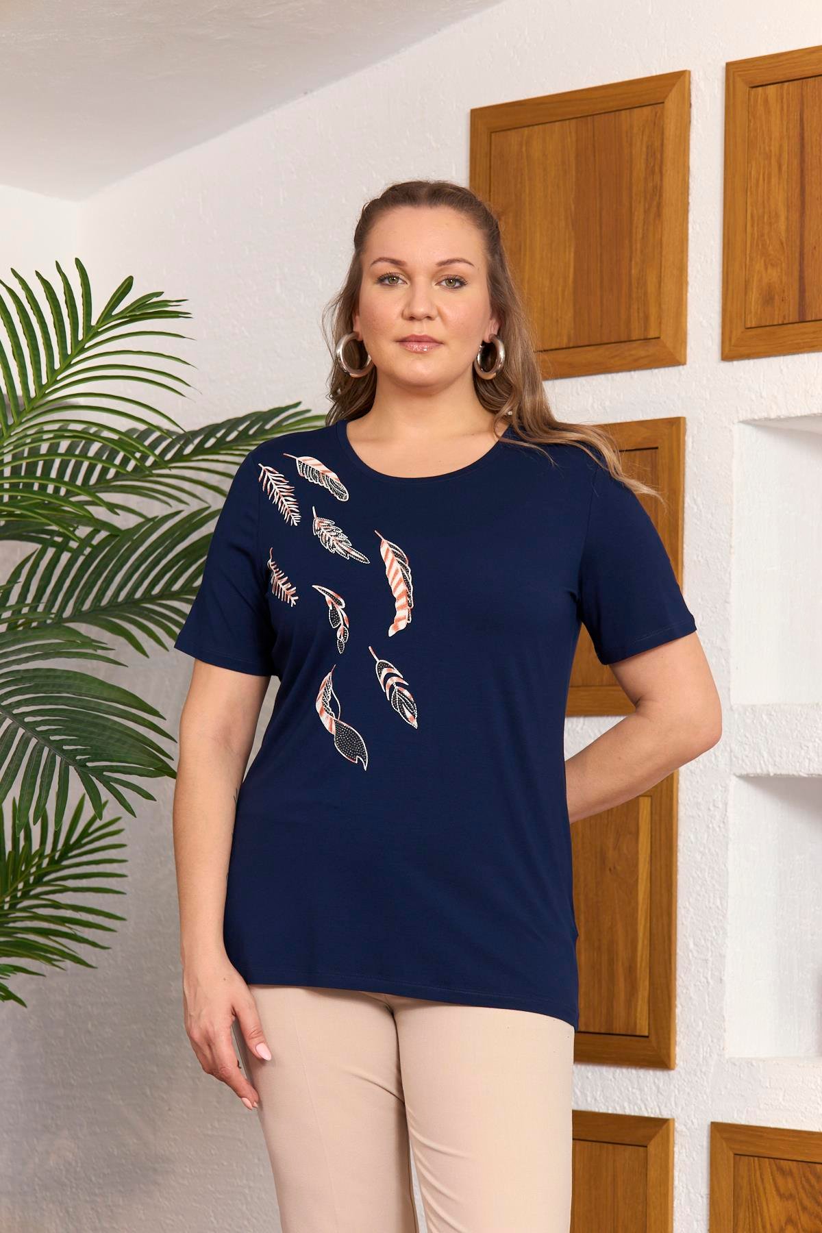 Yaprak Nakış Ve Taş İşlemeli Büyük Beden Lacivert Tişört (O6288-LACİVERT)