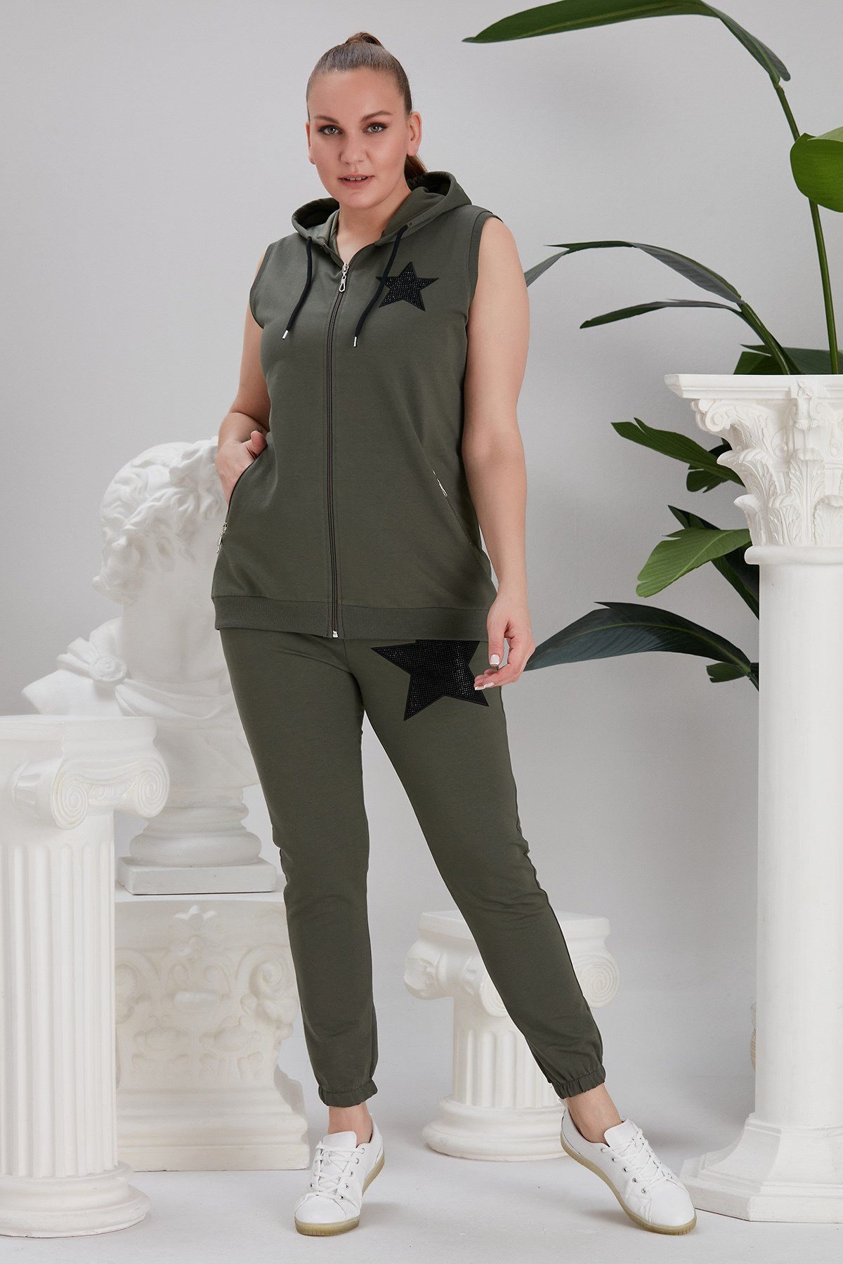Rmg Yıldız Taş Detaylı Büyük Beden Haki Eşofman Takımı