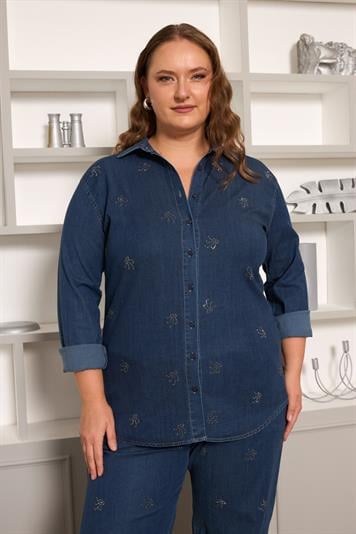 Taş Detaylı Büyük Beden Gömlek Lacivert (O6738-LACİVERT)