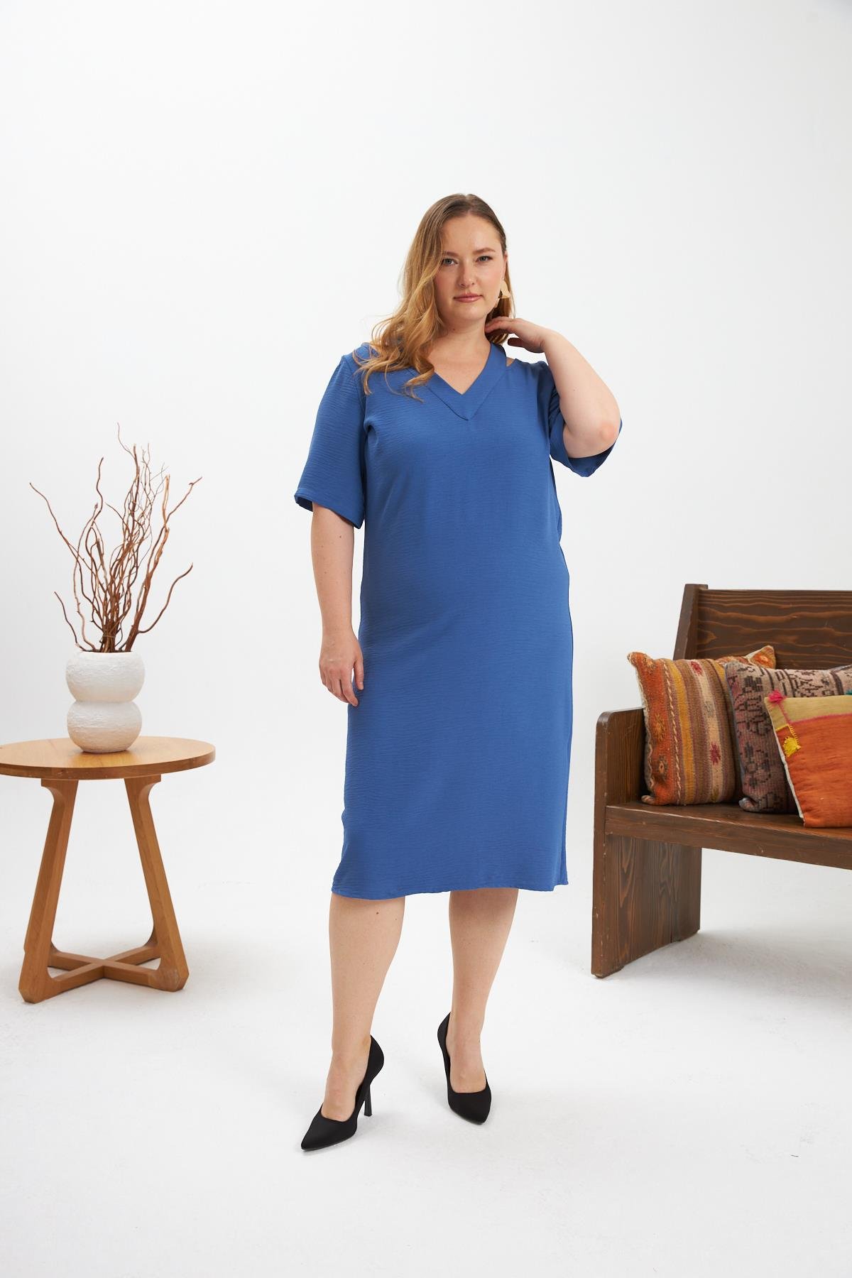 Yaka Detaylı Yırtmaçlı Büyük Beden Elbise İndigo (O6709-İNDİGO)