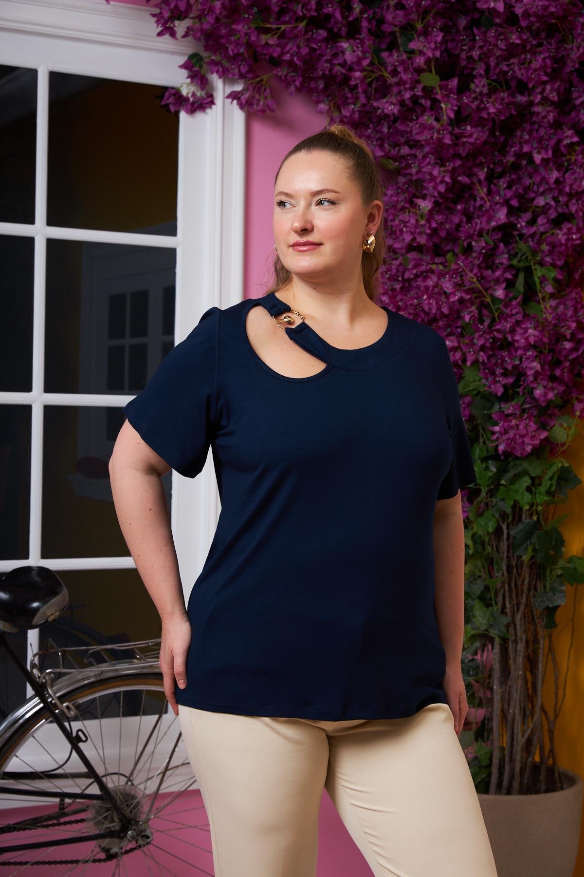 Yaka Halka Detaylı Büyük Beden Tişört Lacivert (O6641-LACİVERT)