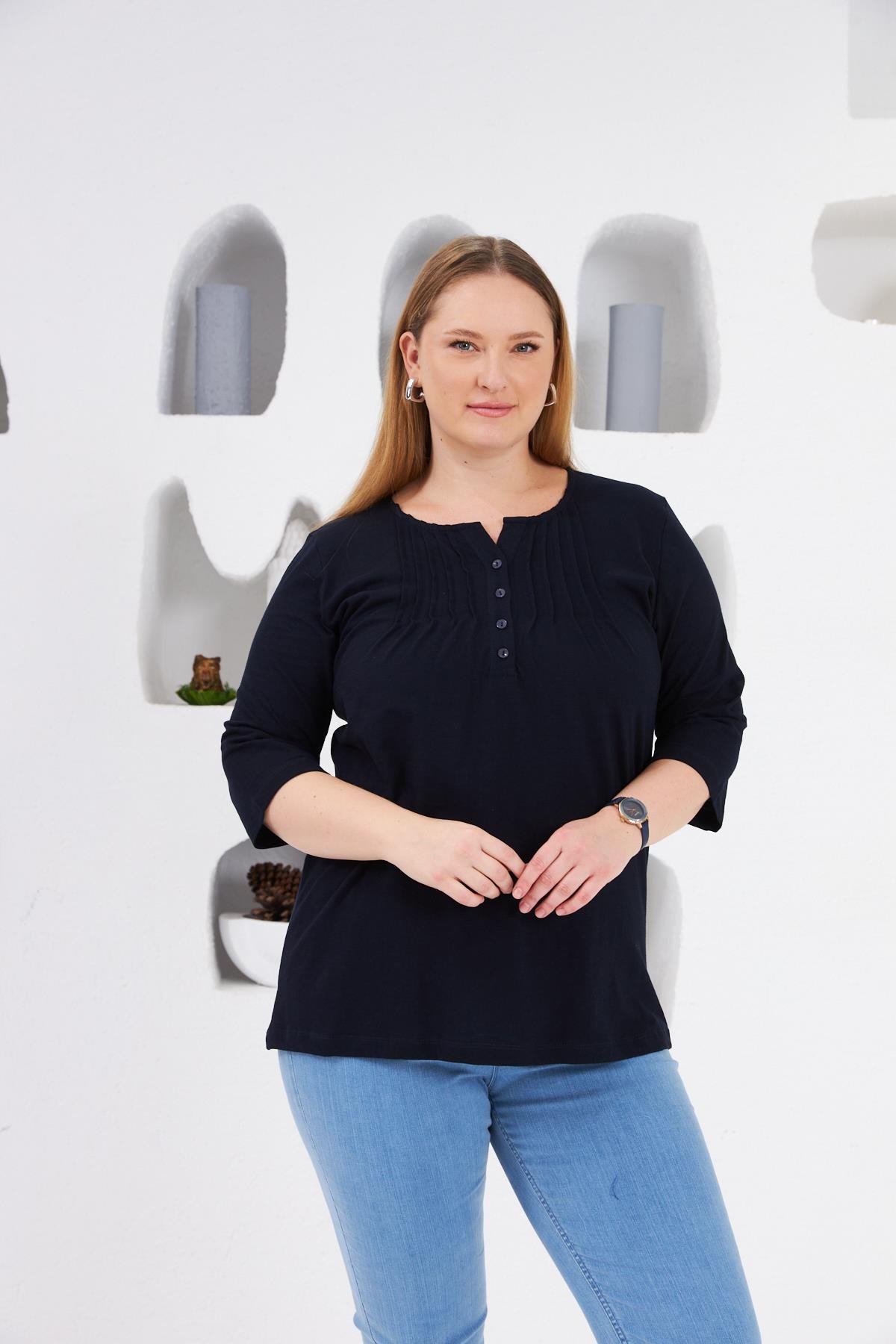 Yaka Nervürlü Büyük Beden Bluz Lacivert (O6660-LACİVERT)